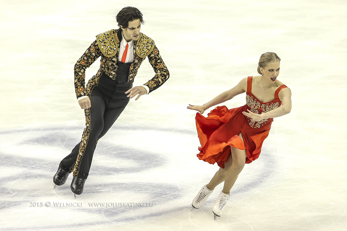 Starker Paso Doble von M. Cock/E.Bates USA, mit persönlicher Bestleistung von 74.47 Pkt. übernehmen sie die Führung. Und sie behalten diese vor den Kanadiern K. Weaver/A. Poje mit 72.68 Pkt. Vorerst auf Platz drei aus Italien die Titelverteidiger A. Cappellini/L. Lanotte mit 72.39 Pkt. Die Europameister G. Papadakis/G. Cizerone erreichen 71.94 Pkt. und damit Platz vier, vor den Russen E. Ilinykh/R. Zhiganshin.